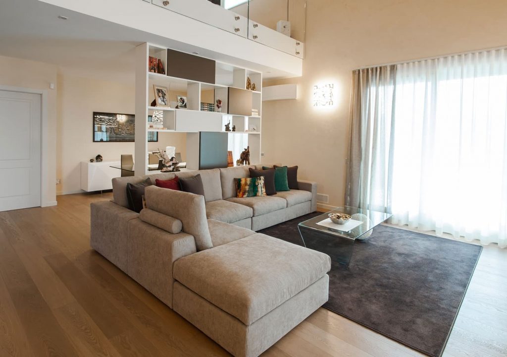 - Delimitare le funzioni con i mobili: potresti utilizzare un divano, un tappeto grande o una libreria bifacciale per separare visivamente la zona living dalla cucina o dalla zona pranzo;